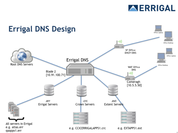 The design goal is to have separate zones, .err for Errigal servers, .crc for Crown servers and .ext for Extenet servers. The IANA root DB was checked [26 November 2015] ] and at the time of writing the domains .err, .crc and .ext are not being used at this time, so there is a reduced risk of causing issues with the general domain name system, however this should be monitored.