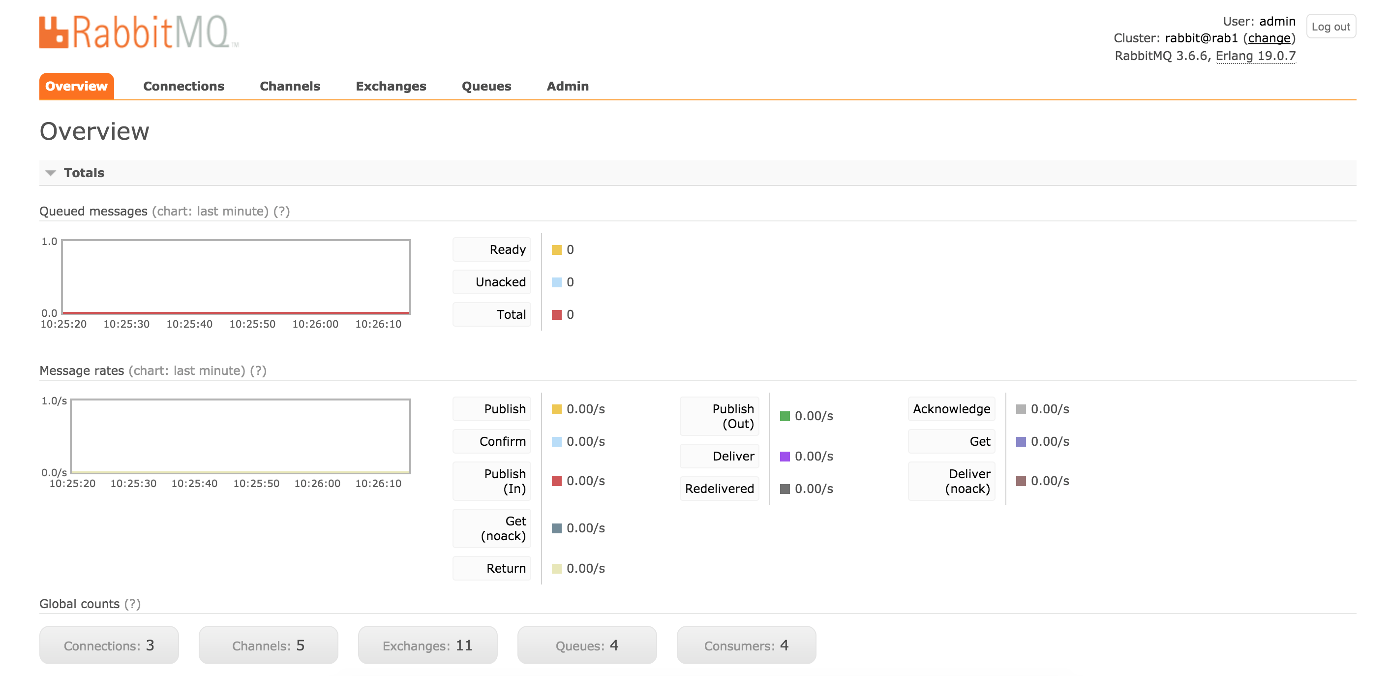 The RabbitMQ GUI shown below can be accessed from port 15672 and is currently only active on ExteNet server - it is usually run on the loadbalancer