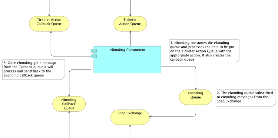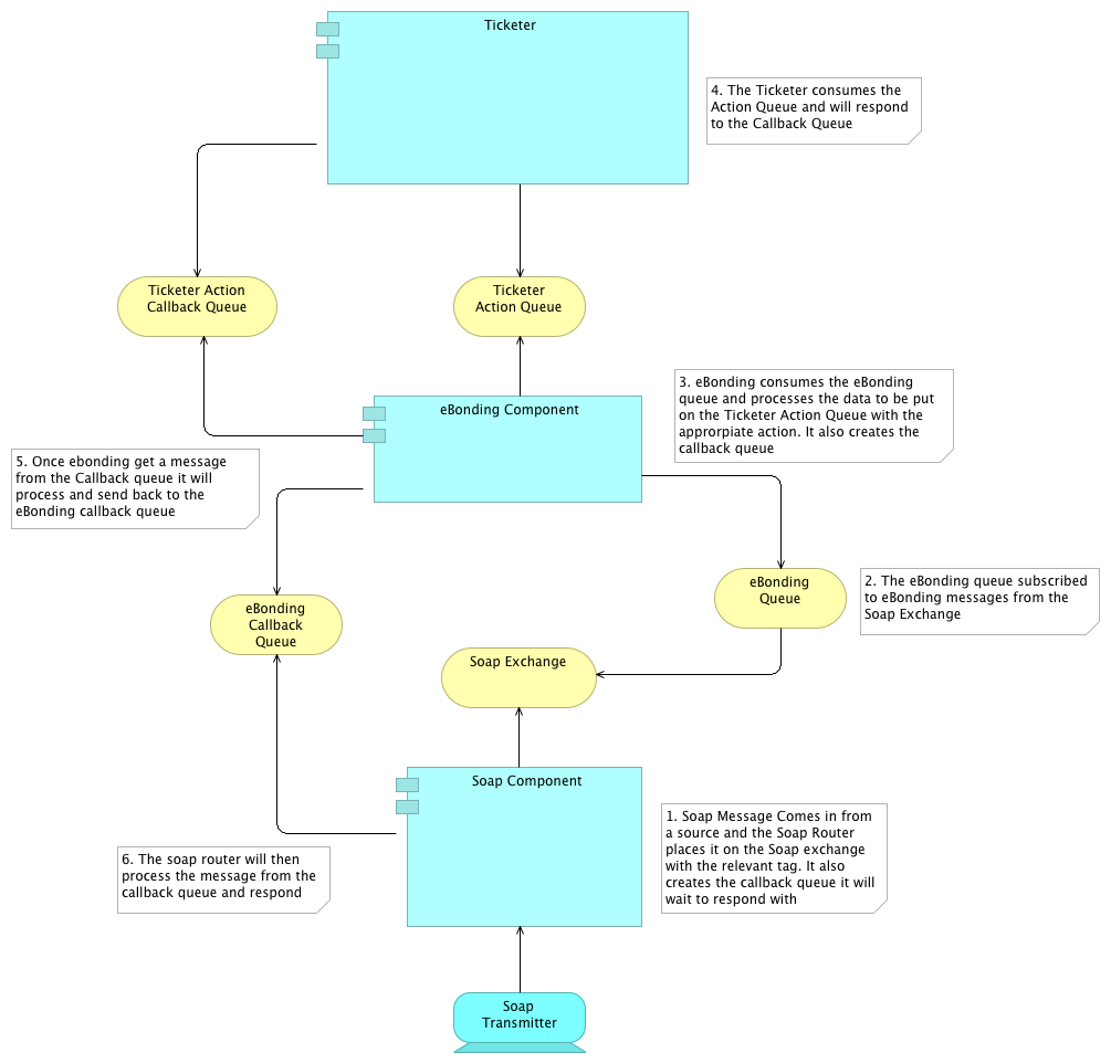 To focus on an InBound Message solely from the perspective of the eBonding component what we see is that our eBonding Queue is bound to the soap exchange via the routing key 'eBonding'. When we receive a message on the eBonding queue the eBonding component consumes it and begins to process the message. During the message processing (possibly more than once) it may contact the Ticketer via creating a callback Queue (Ticketer action callback queue in the diagram) and sending a message to the Ticketer Action Queue. The Ticketer should then process the message from eBonding and fire the response back onto the callback queue (again may happen more than once depending on the action). Once eBonding is finished processing it will reply to the Soap Callback queue titled 'eBonding Callback Queue' in the diagram.
