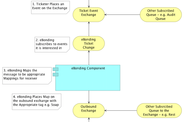 For the outbound message what occurs here is that a Ticketer will publish an event to the Ticket Event Exchange and Tag it with the domain of the event. eBonding is interested in Ticket and Form changes so that is what binds the eBonding Ticket Change queue to the Ticket Event Change Exchange. When eBonding consumes a message from the eBonding Ticket Change Queue it checks to see if it has an eBonded Ticket in it's database relating to the incoming message. If it does not have an eBonded ticket it will forget about the message. It it is interested it will process the message and look for the appropriate message to generate based on the customer associated with the Ticket.