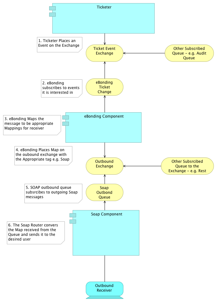 - eBonding publishes the message onto the eBonding Outbound Exchange and tags it with the outgoing tag of the customer (for now lets say soap)