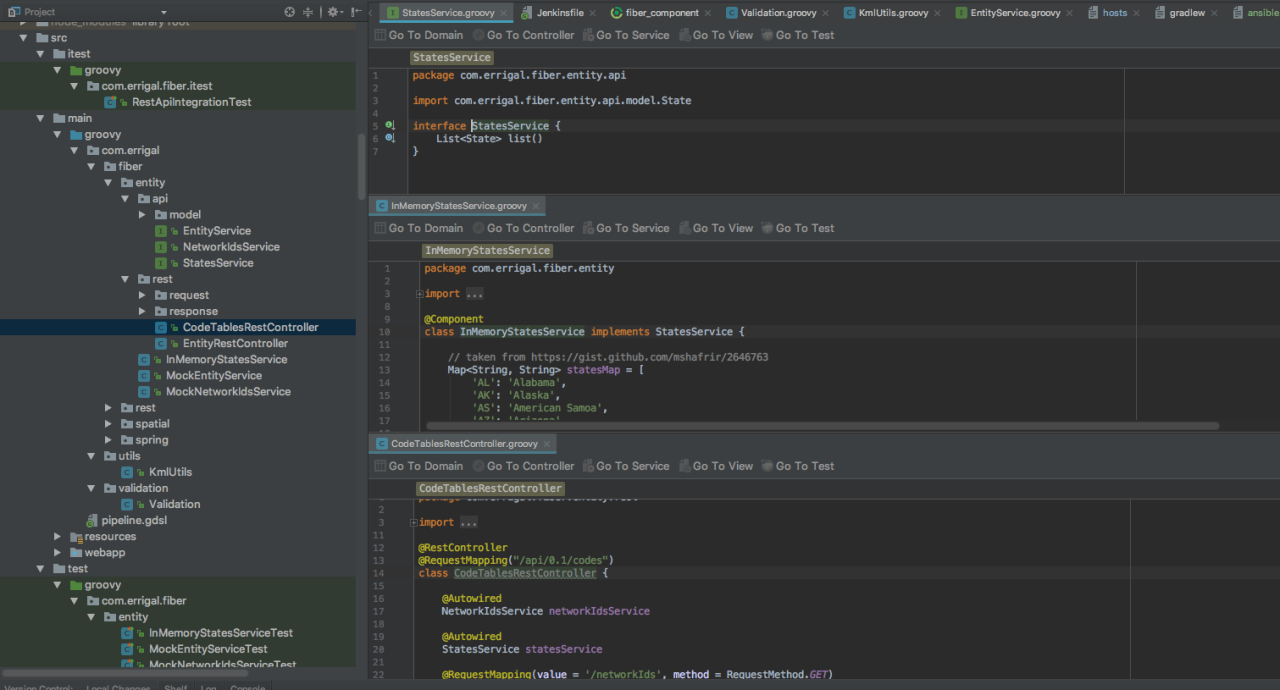There is the StateService interface, which is implemented by the InMemoryStatesService. The implementation needs to be annotated with @Component annotation in order to be injected somewhere else. The mentioned StateService is needed in CodeTablesRestController and it is injected there using the Autowired annotation. At that point Spring will look if there is any class annotated with @Component, which implements the StateService interface. If it finds it, it will inject the instance of that class to the field of the Controller. It is good practice to @Autowire interfaces instead of particular classes.