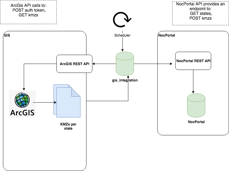 The following wiki details the gis_integration application which handles api calls for transferring kmz files from a specified endpoint to the NocPortal.