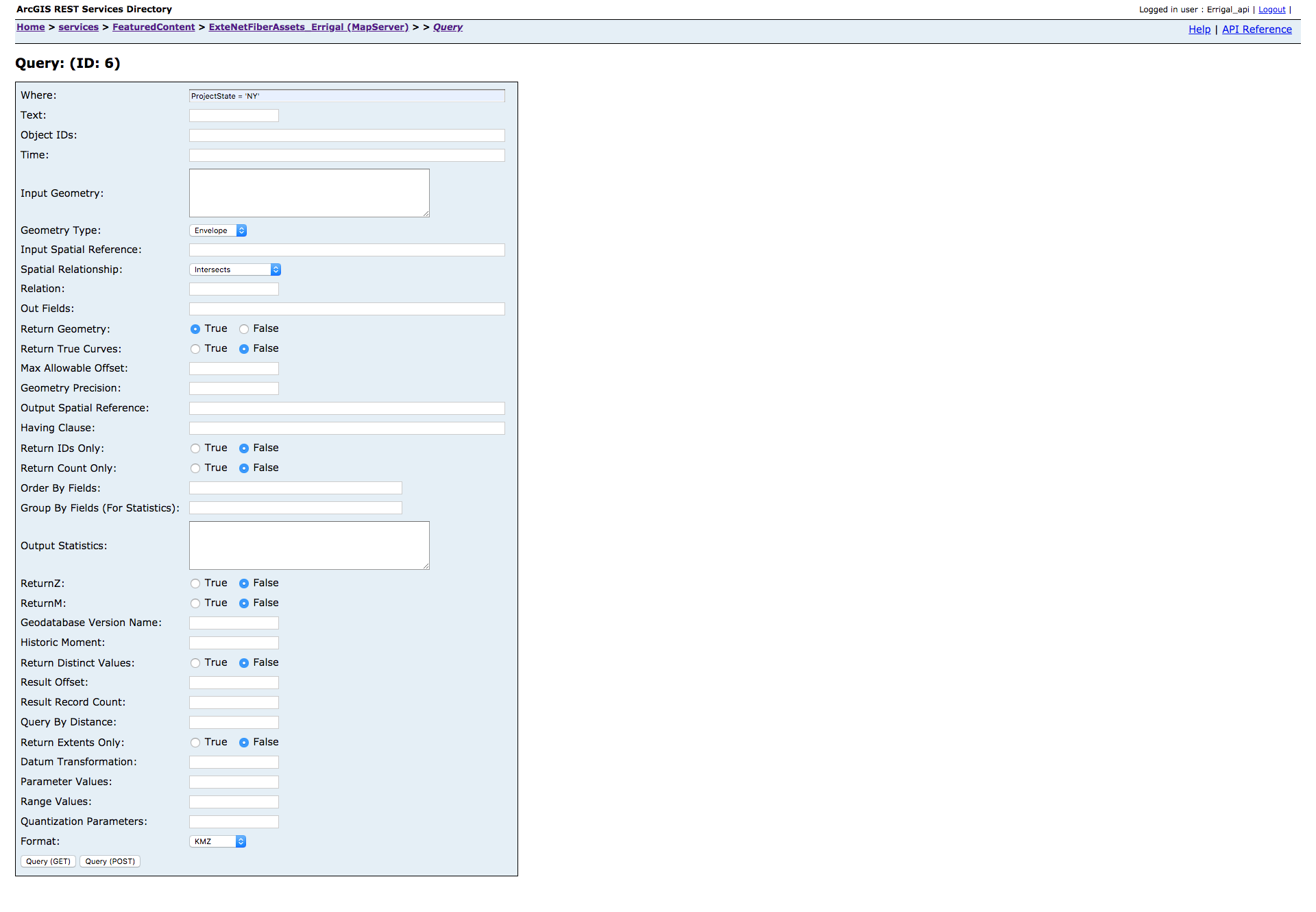 remote.timeout=60000 remote.tokenUrl=https://gis.extenetsystems.com/arcgis/tokens/generateToken?httpClient.soTimeout= remote.username=mzubal_errigal remote.password=mzubal_errigal123 remote.client=remoteip remote.expiration=60 remote.request.format=json remote.request.referer=https://www.arcgis.com remote.queryUrl=https://gis.extenetsystems.com/arcgis/rest/services/FeaturedContent/Errigal_CL_TEST/MapServer/6/query?where=ProjectState=''&geometryType=esriGeometryEnvelope&spatialRel=esriSpatialRelIntersects&returnGeometry=true&returnTrueCurves=false&returnIdsOnly=false&returnCountOnly=false&returnZ=false&returnM=false&returnDistinctValues=false&returnExtentOnly=false&f=kmz remote.whereQuery=where=ProjectState=''