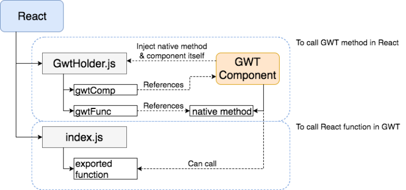 We create JavaScript class (GwtHolder.js) in React App to interface React and GWT.