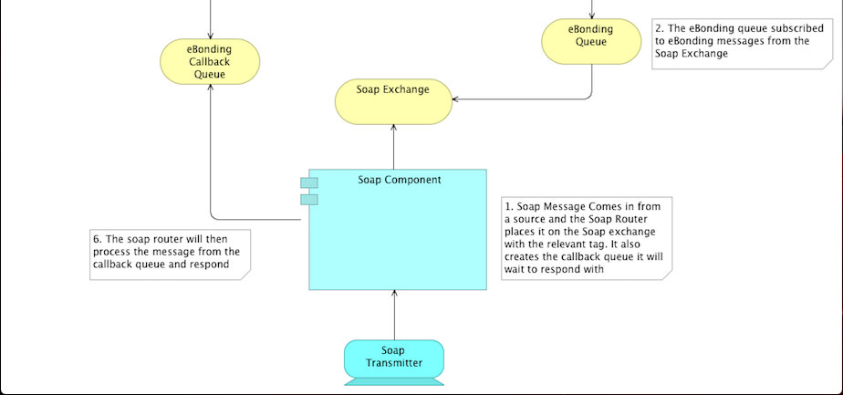Our Soap Router creates a temporary callback queue (queue is destroyed as soon as the channel is closed) titled eBonding callback queue in the diagram above and we will use the message we get from this callback queue as the response we send back to the Customer. We also generate a Correlation ID in order to determine if the received message we get back on this queue is the one we care about (just in case another message makes it on the queue but we don't care about it). The Soap Router also consumes this queue.