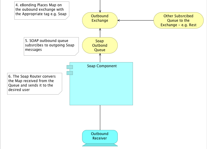 In the case of Outbound the Soap Router consumes the Soap Outbound Queue and binds the queue to the eBonding outbound exchange with the routing key 'soap'. Basically the Soap Outbound Queue waits for soap messages from eBonding only for now.