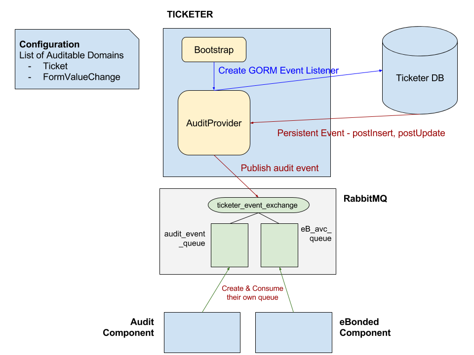After an update occurs on the Ticket domain or an Insert occurs on the FormValueChange domain, a JSON object is built. This JSON object contains information including the old value, new value, event type, changed properties, domain, ticket id and full object. This JSON object is passed onto an exchange, to which the ebonding_component is subscribed to. From here the AVC is processed and sent onto the soap_component and form there to the carrier in the form of a soap response.