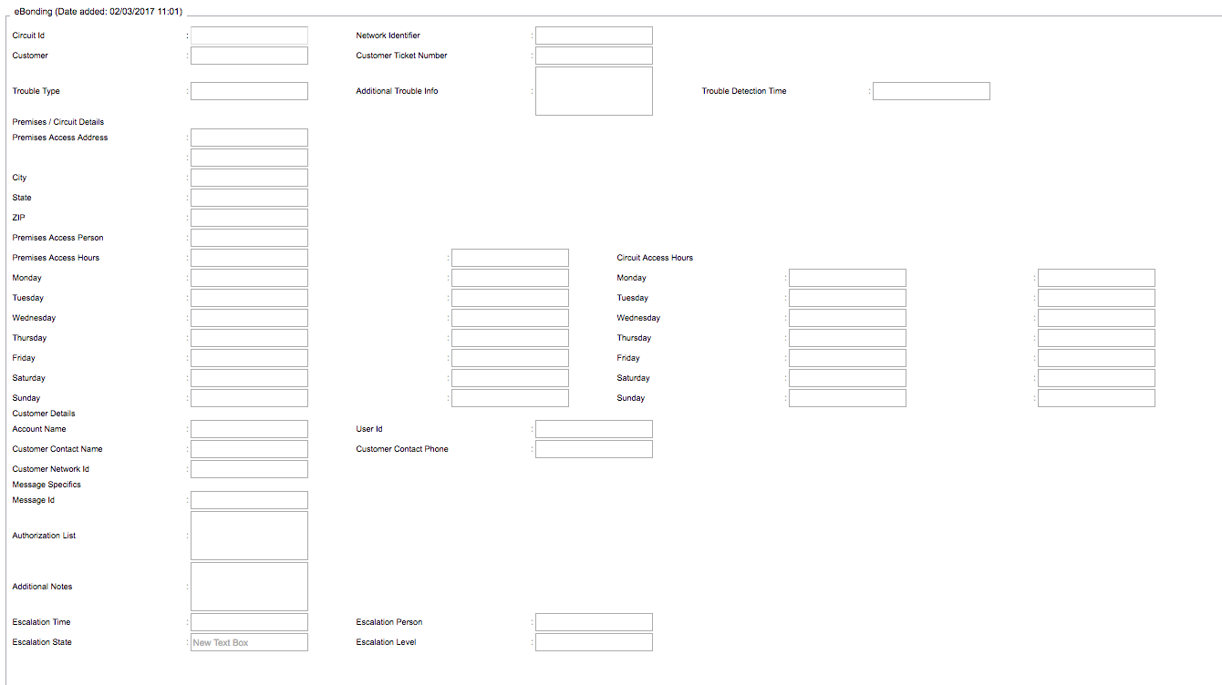 The eBonding form should display as represented in Figure 5. The only editable field to the user in this form is the Circuit Id. All other form fields are uneditable. All of these fields are populated via the create message sent to the Ticketer from the ebonding_component. Each field is also track in running log true. The additional_notes field gets updated via MODIFY, VERIFY AND CANCEL messages which are sent to the Ticketer via the ebonding_component also.