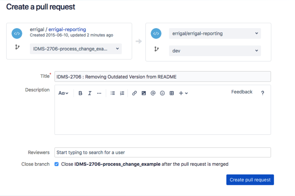 - Ensure to check Close Branch. This will close the branch and delete its Jenkins build once merged.