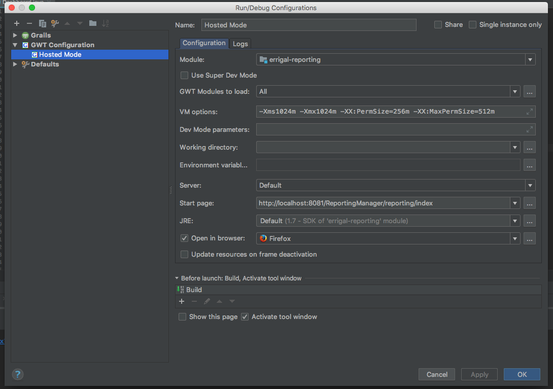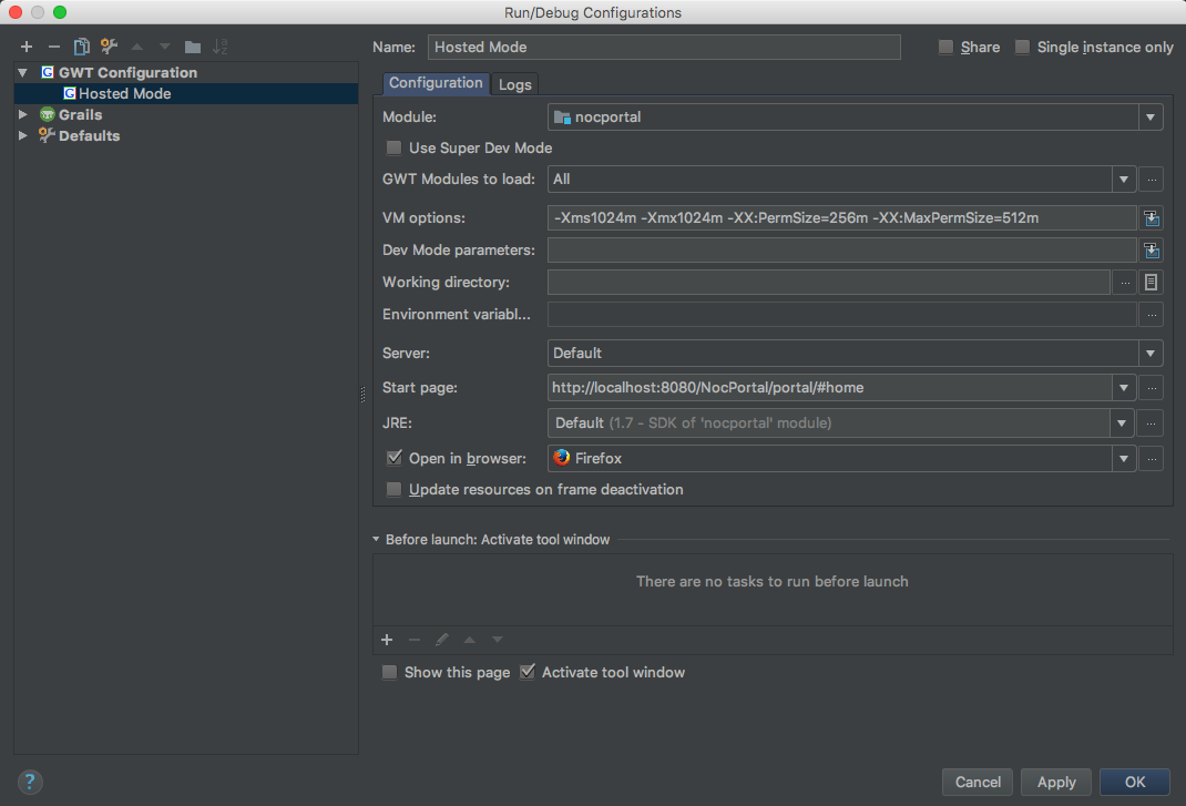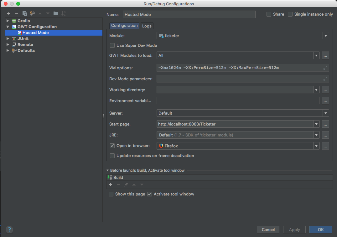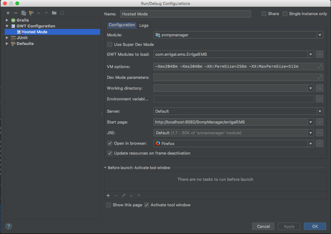 Following steps describe how to make the GWT Dev Mode work in order to be able to do debugging of the GWT code. It assumes you have the project (e.g SnmpManager) working and running locally in IDEA (the how-to is here).
