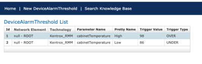 The SnmpManager domain DeviceAlarmThreshold is utilised for inserting parameter alarming threshold entries for display on the parameter threshold vertical slider in the Mobile Navigator. These entries are associated with a technology and network element entry via this table. The downstream impact of this configuration is that an alarm can be thrown for a parameter is it breaches either a high or low threshold for its discovered value. This alarm will then display in the mobile navigator with the alarm colouring indicators for the parameter.
