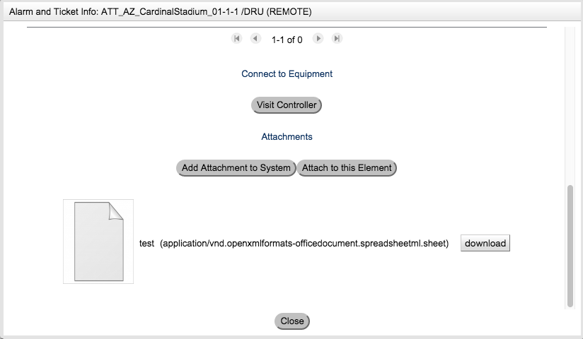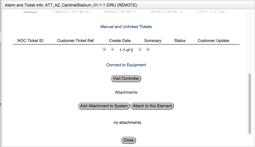 - Once you have located the element and opened the pop up containing ticket and alarm information, scroll to the bottom of that display box. There you will the Attachments section: