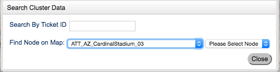 The search cluster data dialogue pops up when Search is clicked and has options for searching by ticket id, Hub and node.