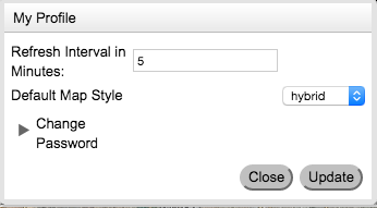 The user can also set a refresh interval on their profile through the manage account tab. This tab also provides the user with a way to change their password and default map style: