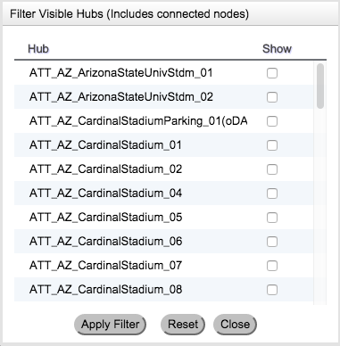 The filter visible hubs feature displays a pop up box which allows the user to display specific hubs by selecting their corresponding checkbox.