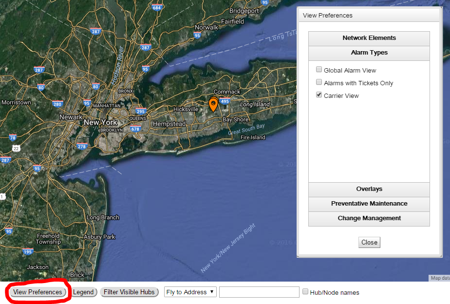 As mentioned previously in Demonstrate understanding of how network elements and markets appear in Portal the map view will zoom to the location selected and various markers will be shown on the map depending on the selected view. See below: