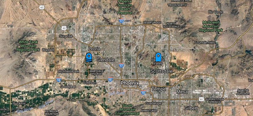This allows us to view change request ticket results for network elements which are currently marked as off air. These will display on the map with two black stripes through the marker as demonstrated below: