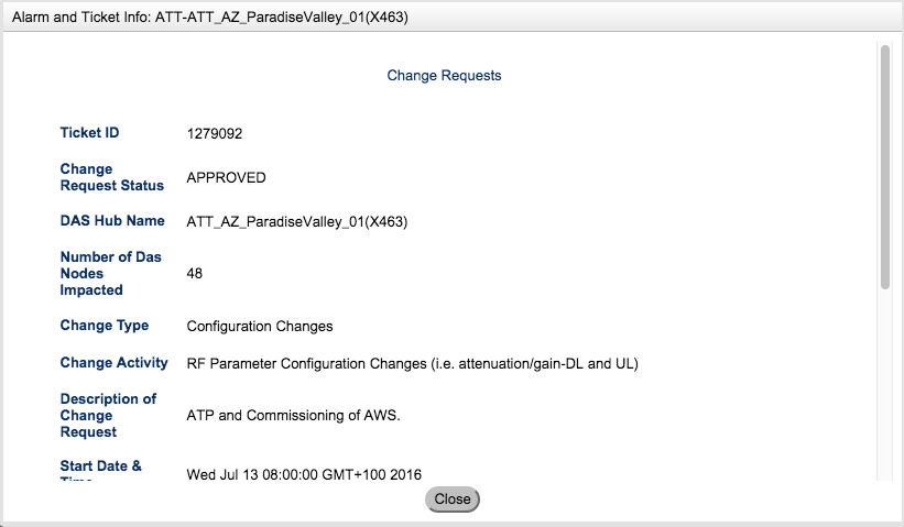 As demonstrated above, change request markers are configured in blue. If you double click on the marker this provides ticket information, ticket status and form related information from the change_request form.
