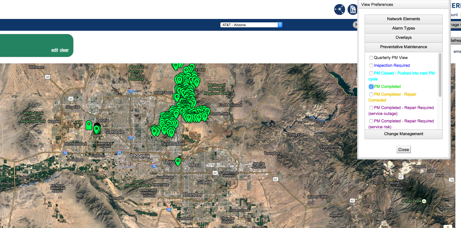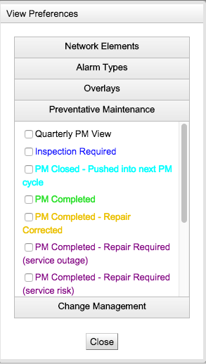 - The Noc Portal has a configuration option to display specific Preventative Maintenance status tickets on a per cluster basis. These options are available to the end user through the View Preferences panel located at the bottom of the map in the portal view.