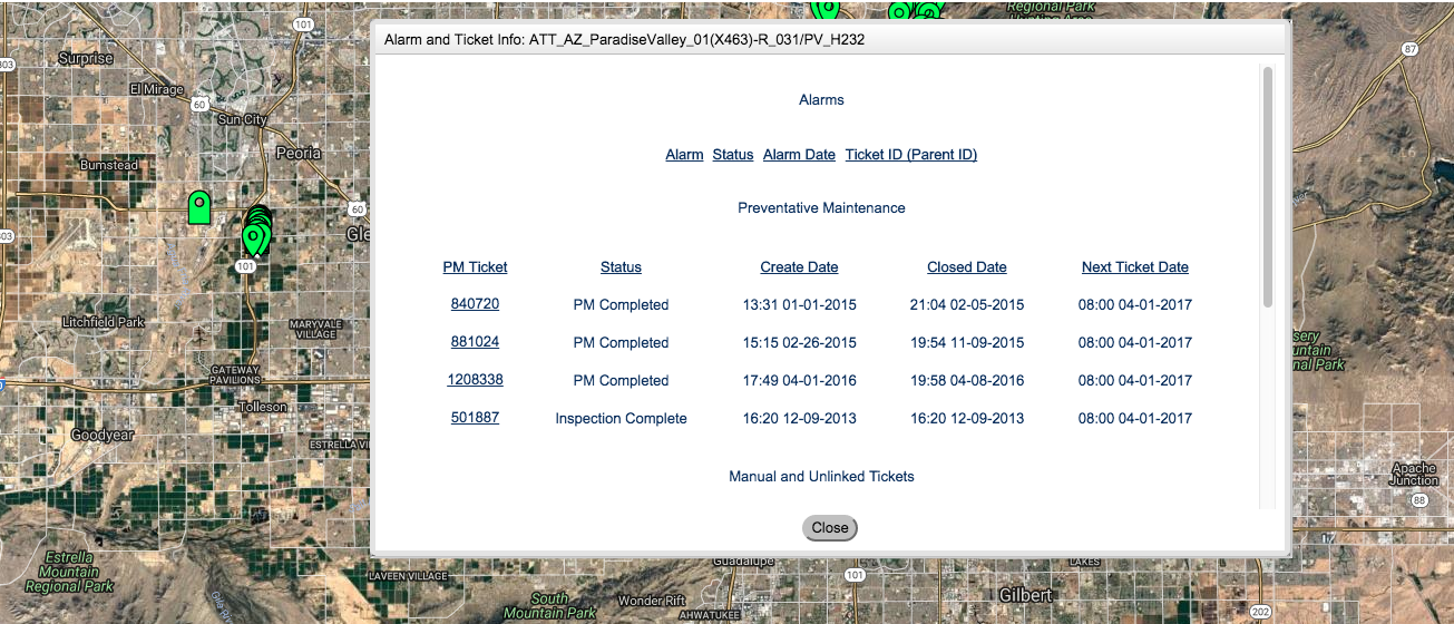 - Navigate to that cluster in the NOC Portal and select this status from the Preventative Maintenance View Preference. Note the markers returned and click around their windows to ensure these ticket statuses are available within the markers displayed.