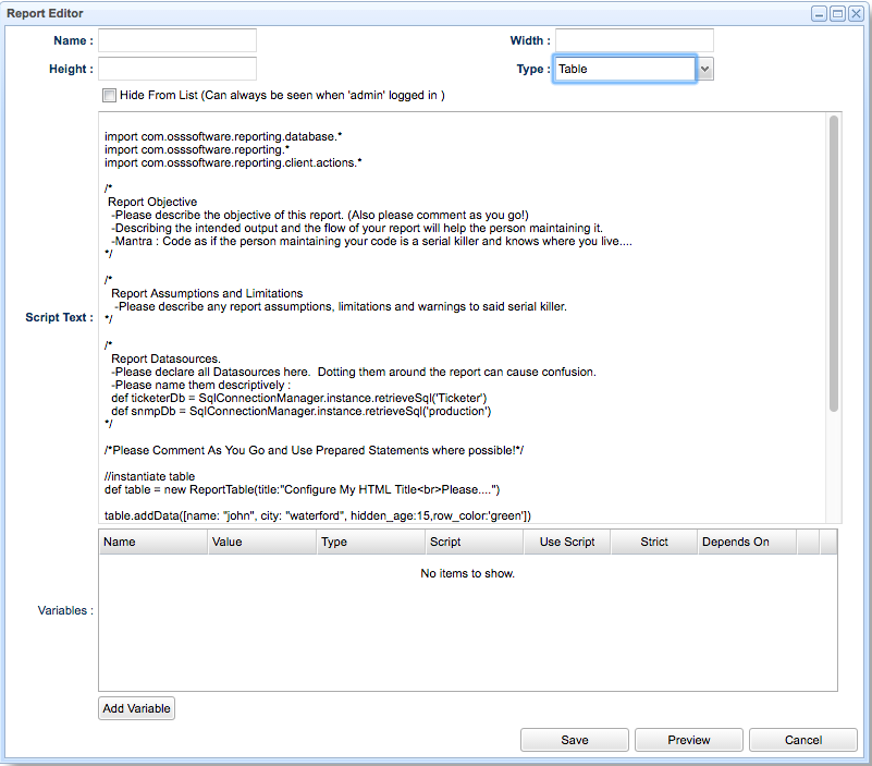 The key to this report is the addData method which accepts a map and then outputs the map as a table such that the key is the column name and the value is the cell value. Thus adding multiple maps will add more rows to the table (remember each map should have the same keys as one another and in the same order so the output correctly).