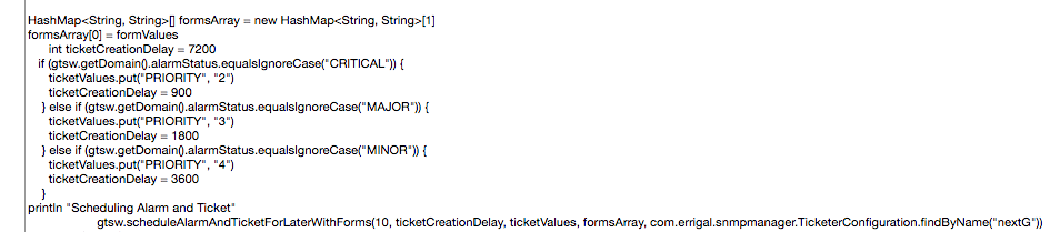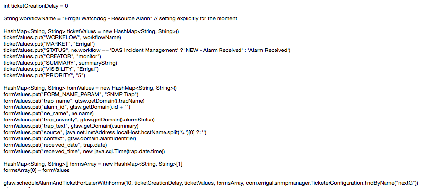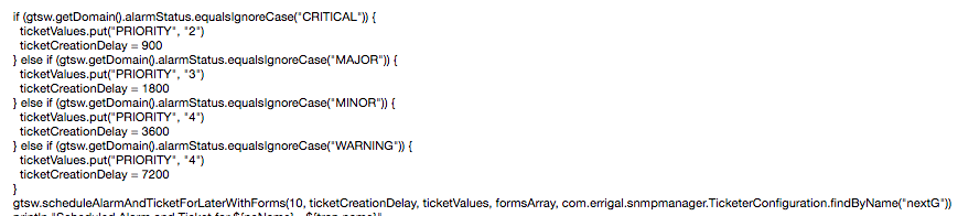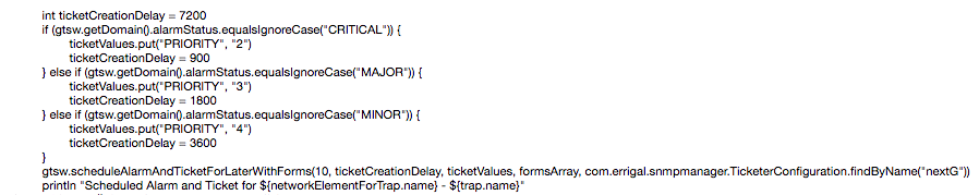 The logic for triggering ticket creation based on incoming alarms can be customised in a trap rule for a specific vendor/equipment type. Our trap rules are written in Groovy. Please see some screenshots of the important pieces of these rules, in relation to automatic ticket creation.