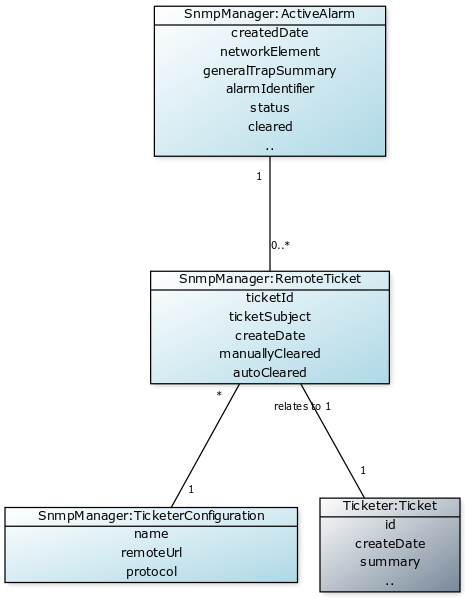 The SNMP Manager interacts with the Ticketer application in order to automatically create tickets from incoming alarms based on service level agreement timeframes set our by our customers. This is often based on alarm severity: Critical, Major, Minor, Warning, etc. Tickets do not create for 'Informational' or cosmetic alarms from telecoms systems, by default.
