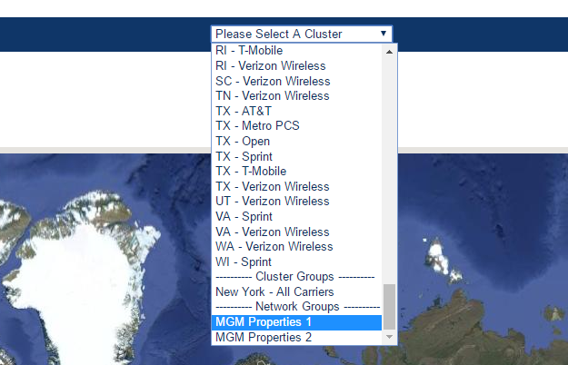 From the front end of the Noc Portal, network groups can be viewed from the Dropdown menu in the top centre of the screen: