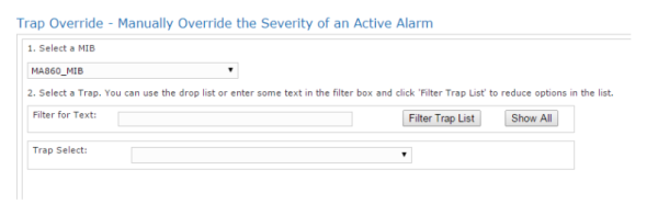 Trap overrides are put in place to manually override the severity of an active alarm. By default, informational alarms are not ticketed. Begin by selecting a particular MIB. This will then populate the next step which is to filter for text or to select a trap from the Trap Select dropdown menu.