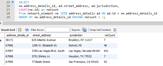 SELECT ne.address_details_id, ad.street_address, ad.jurisdiction, COUNT(ne.id) as neCount from network_element ne JOIN address_details ad ON ad.id = ne.address_details_id GROUP BY ne.address_details_id HAVING neCount > 1;