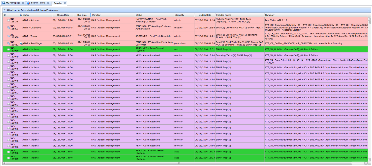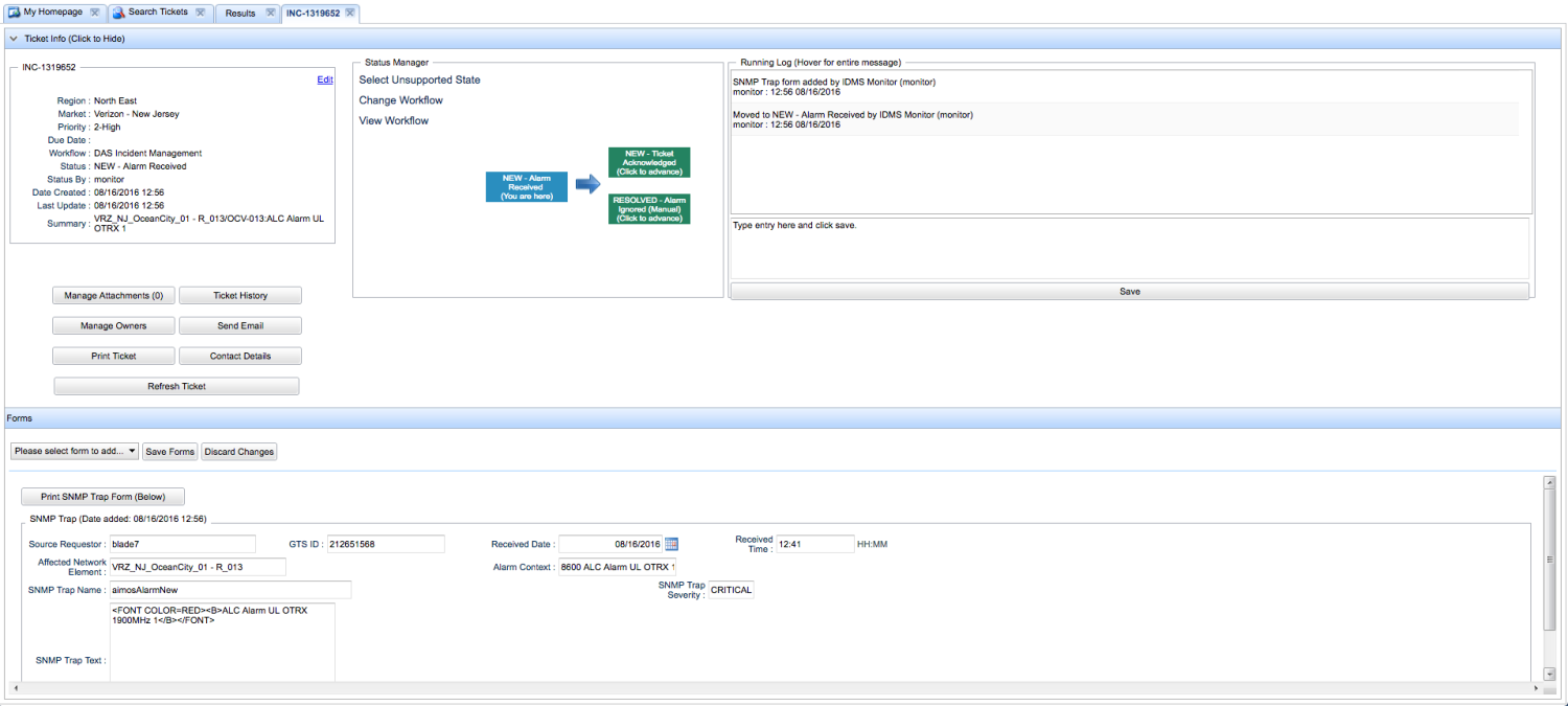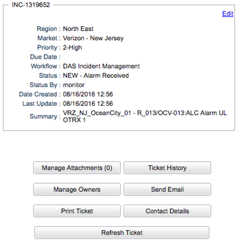 - Create a new Ticket in the DAS Incident Management Workflow. Give it a Due Date of a week from now and set AT&T - New York as the Market. Include an informative summary and assign some owners to the ticket. Make note of the ticket number.