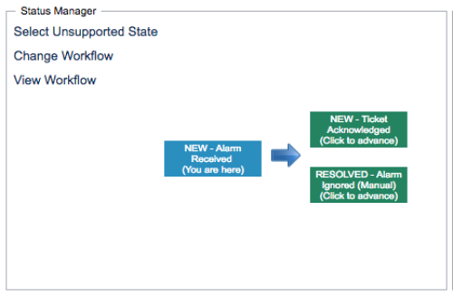 The panel in the centre of the ticket screen is the Status Manager. The options in this panel allows the user to move the ticket to a new state, update it's workflow and, if the user has admin status, move it to an unsupported ticket state. It will also show the state that the ticket was previously in and what legal transitions the ticket has.