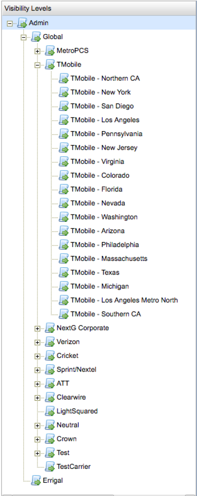 Below Global, there are the separate carrier visibilities, AT&T, T-Mobile, Verizon, Sprint etc. A user with a top level Carrier visibility, for example ATT, can see all AT&T tickets, no matter if they have a specific region assigned or not. A user with just ATT will not be able to see any other carrier tickets, nor will they be able to see any forms that have a Strict Admin or Strict Global visibility.