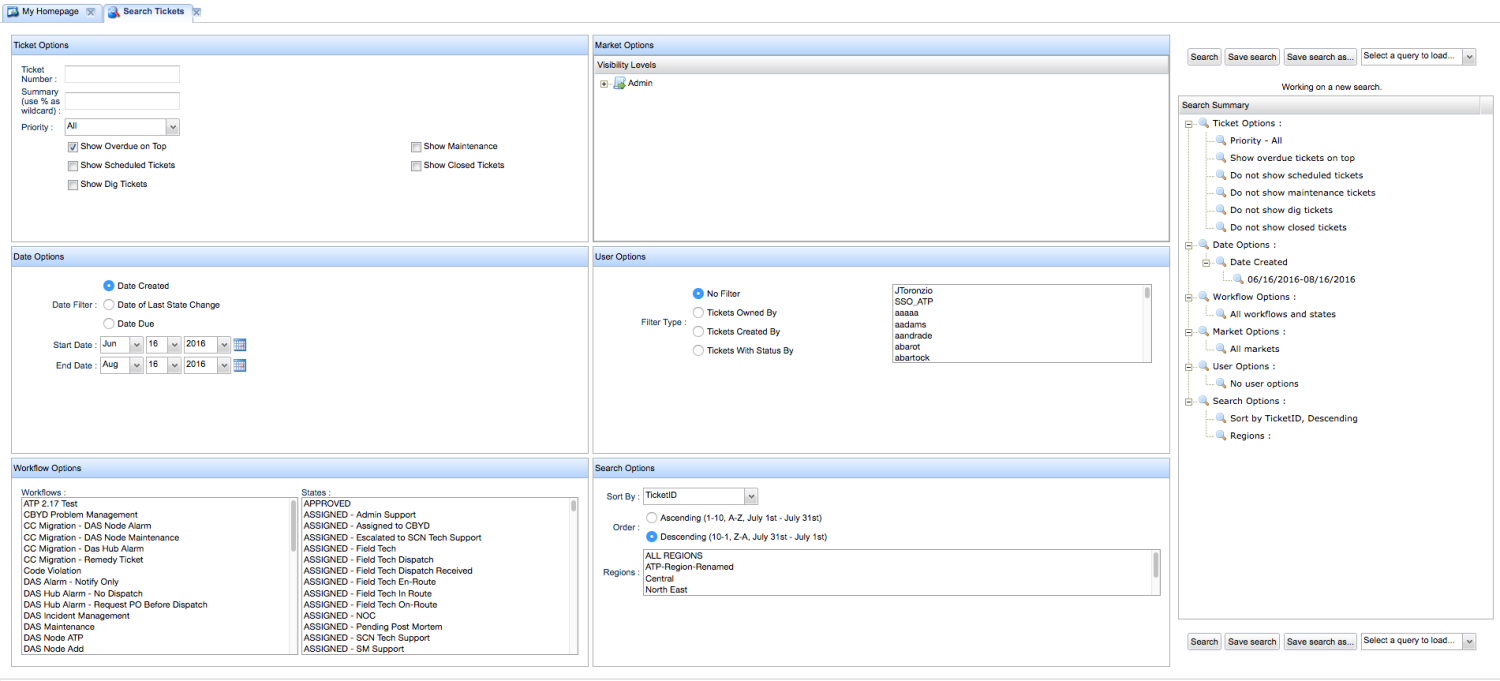 The advanced search page, shown below, allows the user to define a number of search parameters such as Ticket options, Date Options, Workflow Options, Market Options, User Options and Search Options.