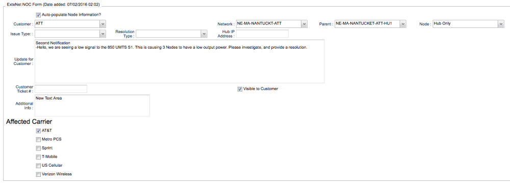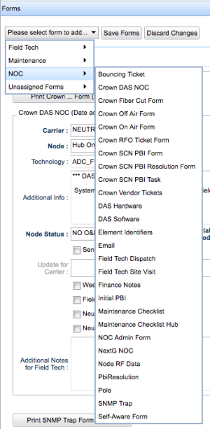Possibly the two most important and customer visible forms are the relevant NOC forms. For ExteNet it is the ExteNet NOC Form. These forms are added to all tickets that create as a result of us receiving an alarm into the Node Monitor. These forms are usually added automatically when the ticket is transitioned into a state of investigation by the NOC. The NOC forms can also be added to Manual Tickets.