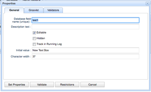 Double clicking on a component will open it's properties window. From here you can fill in the Description Text, whether the component is Editable, Hidden or Tracked in Running Log, The initial Value and the size of the component. You can also define groovlets and validation in this window. Restrictions can also be set on the form component to allow the field to be editable to users with certain roles.