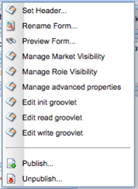 Selecting the Current Form dropdown in the top left corner of the Form Architect will allow you to set the role and market visibilities as well as managing the advance properties on the form.