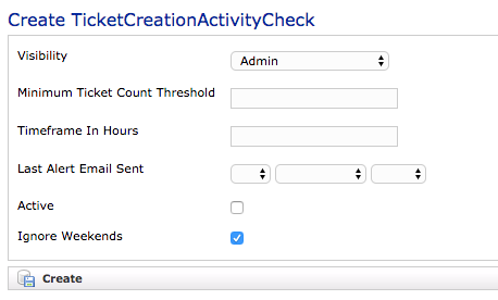 As previously mentioned this is assigned on a visibility level. To configure a ticket creation check on a specific market you can navigate to the controller page located in /Ticketer/ticketCreationActivityCheck/list . From here you can add a new TicketCreationActivityCheck. The form looks as follows:
