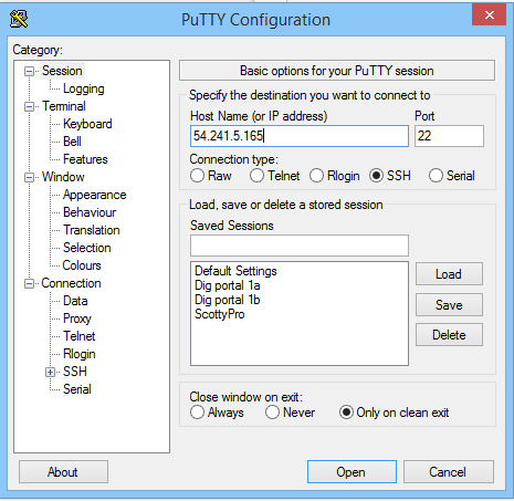 Start up PuTTY and input the desired Dig Portal’s IP Address. You can find this in the hosts file of your computer, which is found under “C:\Windows\System32\drivers\etc”. Your screen should resemble the following: