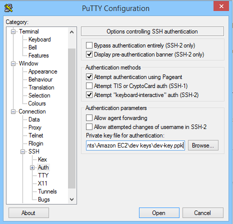 Next, we are going to use the digportal.ppk file to connect to the instance. We need to use the “Auth” for this, found under “Coonection/SSH”. Then, click on “browse” to select the digportal .ppk file. See below for an example of this: