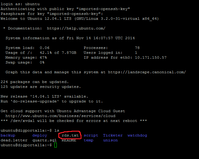After logging in, the “rds.txt” file should be in the directory you begin in: