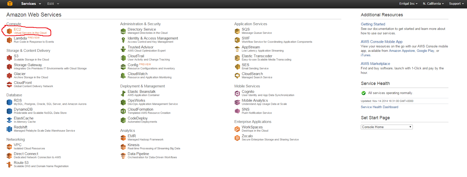 After logging in, you should see the following screen. Click on the “EC2” link: