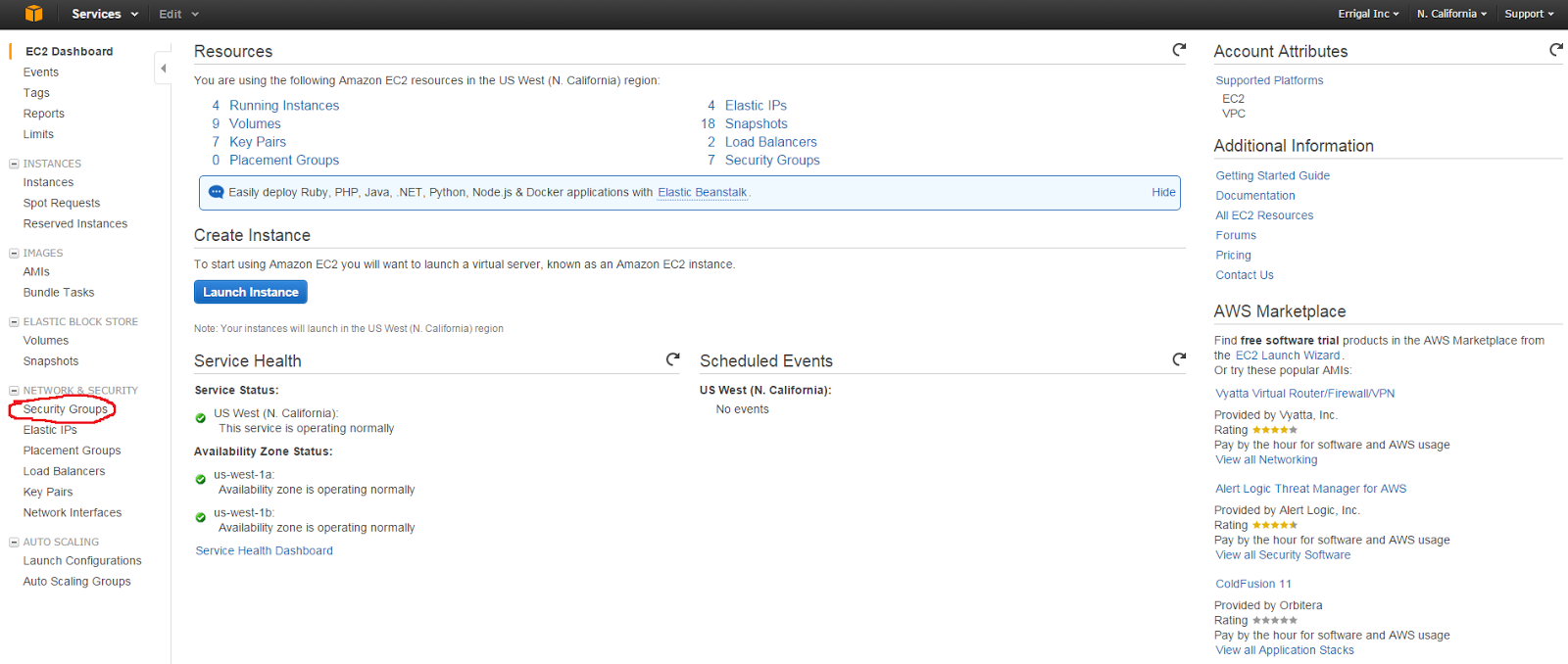 Where you should click on “Security Groups”, which will bring you to a list of the security groups: