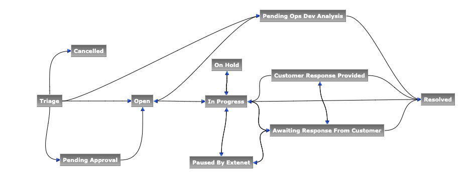 This workflow is used for ExteNet support tickets. The nodes/states present in the ExteNet workflow is as follows: