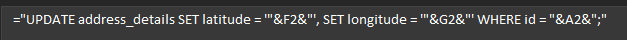 '“& <cellreference> &”'with a text value - So now you have your query and you can copy it down to the other rows by clicking the cell, hovering over the bottom right corner until your mouse icon changes, and then double clicking. (You can also click and drag the handle to copy cells down)
