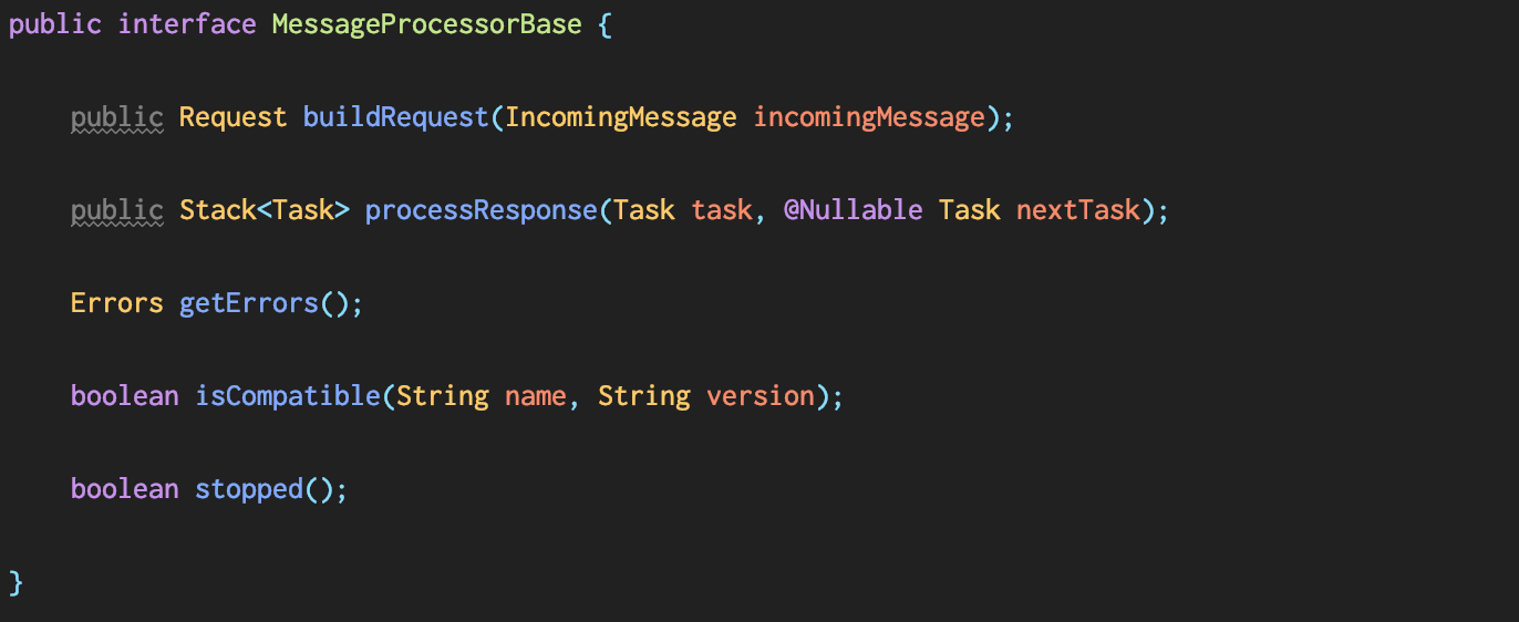 An example definition and explanation of each of the Message Processor Base Interface methods are outlined below. Every processor interface in the RDF agent implements this base interface so it is important to understand what each of these definitions are and what is expected in the implemented behaviour. The below image shows the interface method signatures.
