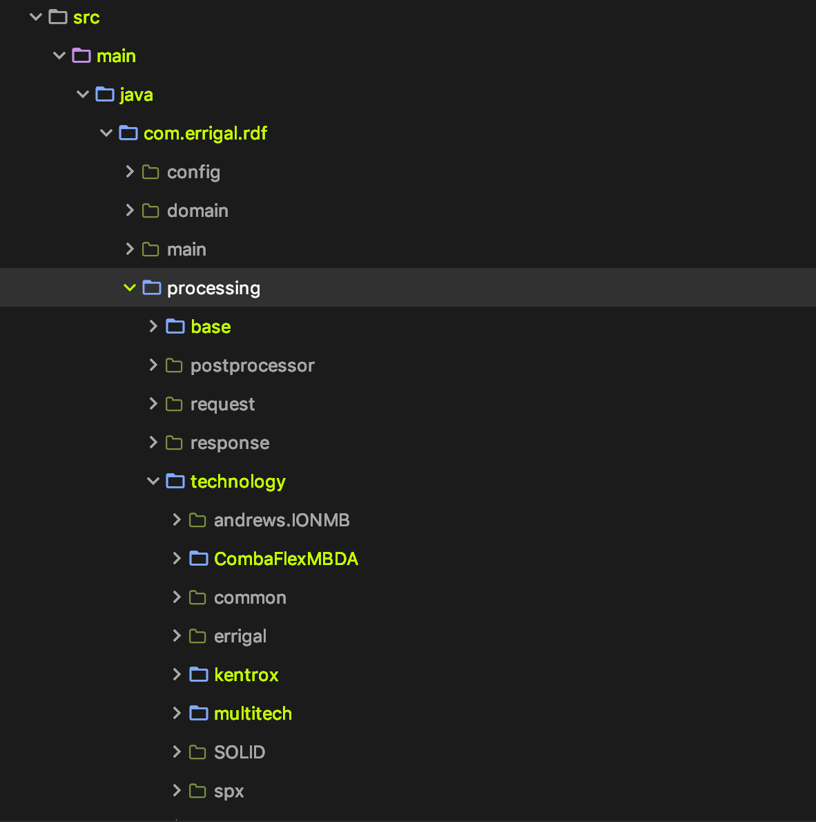 In the RDF Agent project, processors are located in the 'com.errigal.rdf.processing.technology' package. All processors are located here separated by technology name. If you are adding a new technology stack to the RDF Agent, you would add a new package directory in processing/technology package. See below: