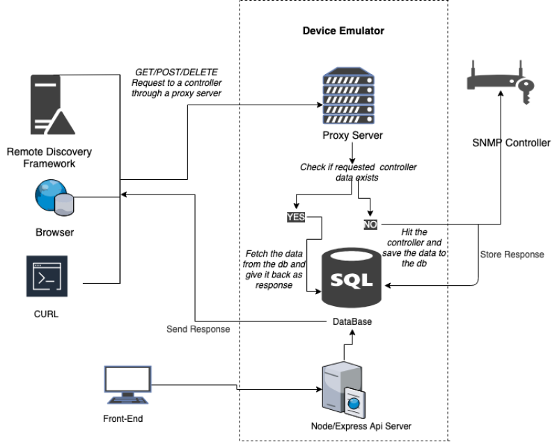 The purpose of the Device Emulator is to provide reliable testing mocks for network devices. This is achieved by establishing a proxied connection between the development machine and the device to be tested and caching the responses corresponding to each request. In practice, this means that the first of any particular request goes straight through to the device, while all subsequent requests receive a cached copy of the response.