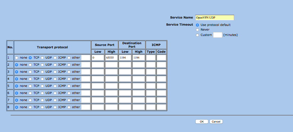 - Give your service a name, say we want Open VPN and are using UDP call it OpenVPN UDP
